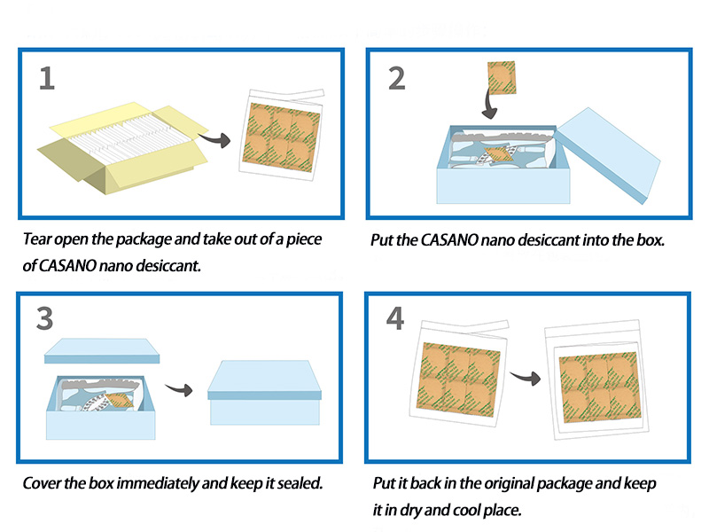 Nano desiccants can be used to store and control the relative humidity of environments for items such as footwear, apparel, leather goods, food, pharmaceuticals, electronics, mechanical components, and cultural relics, preventing moisture damage, mold growth, and corrosion.